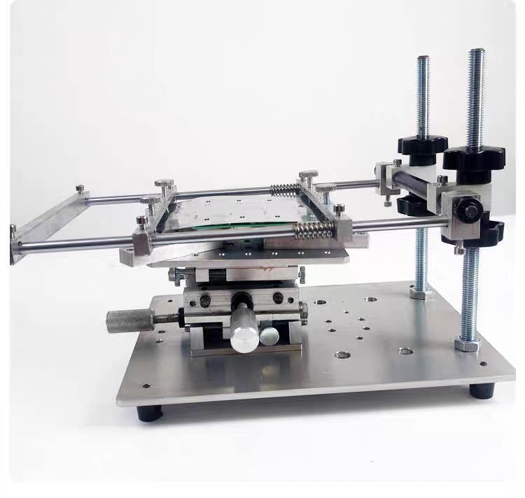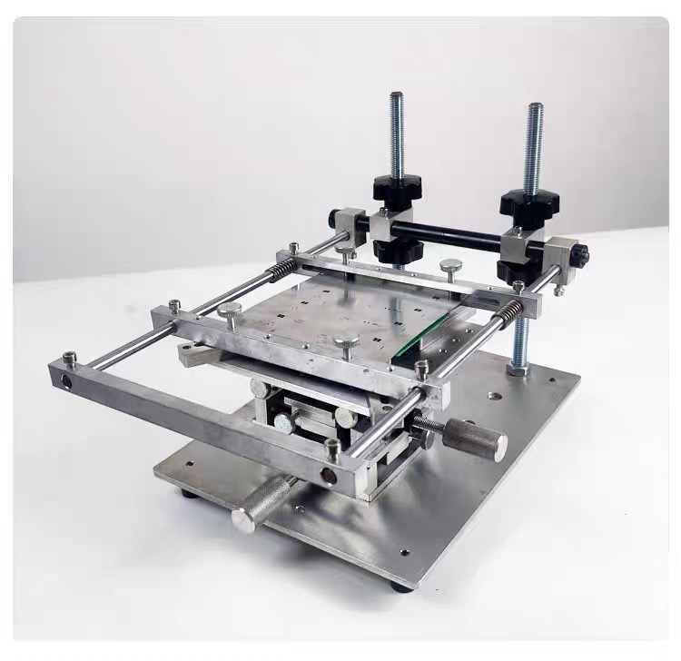 Manual frameless SMT solder paste stencil printer – compact benchtop design, compatible with max 290×170mm stencils and 150×150mm PCBs, 150×150mm customizable platform, 300×230mm base plate, great for small-batch/prototype PCB soldering.